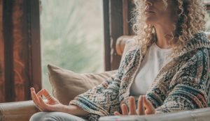 Close up of adult woman in yoga position and meditation indoor activity at home – concept of healhty and relaxed lifestyle people – female sitting and enjoying peace and mindfulness exercise